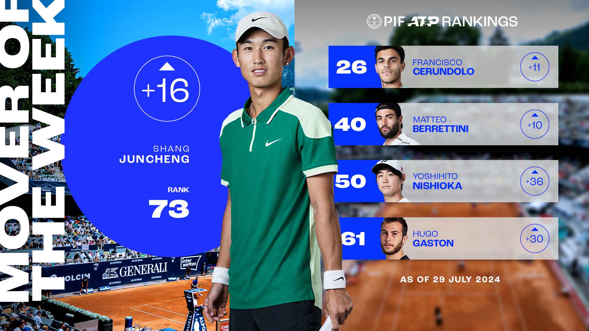 #NextGenATP Shang Juncheng enjoyed one of the best weeks of his young career in Atlanta to rise to a career-high in Monday's PIF ATP Rankings. Italian Matteo Berrettini is back in the Top 40 for the first time in 11 months after claiming his second consecutive title in Kitzbühel and Argentine Francisco Cerundolo was crowned champion in Umag.